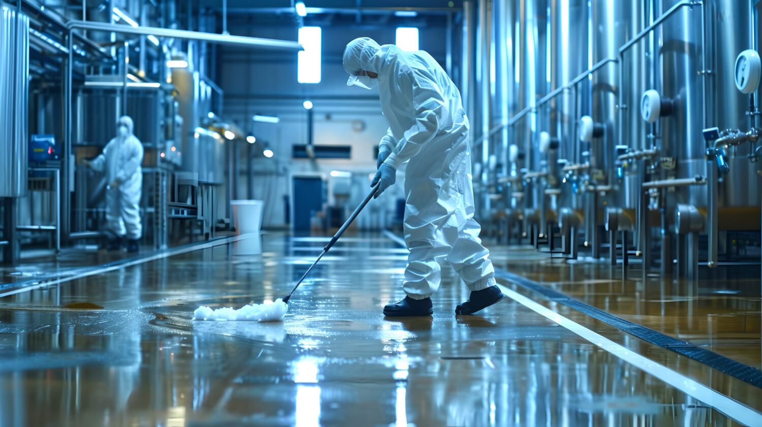 A worker in a hazmat suit meticulously cleans the floor of a sterile industrial corridor. AI